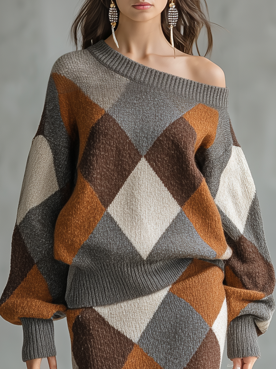 A charm retro‑style elegant color‑blocked diamond‑patterned knitted top and skirt set blends vintage sophistication with contemporary polish. The diamond motif nods to classic mid‑century knitwear, while the color‑blocking refreshes it with crisp, modern contrast. The knit texture offers coziness and slight structure, making the ensemble flattering yet comfortable. The matching skirt—a pencil—balances the semi‑relaxed top for a harmonious silhouette.