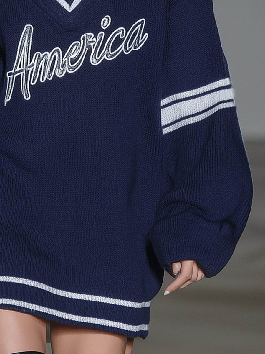 2. Design: V-neck, contrasting white panels, and American English embroidery on the chest.
