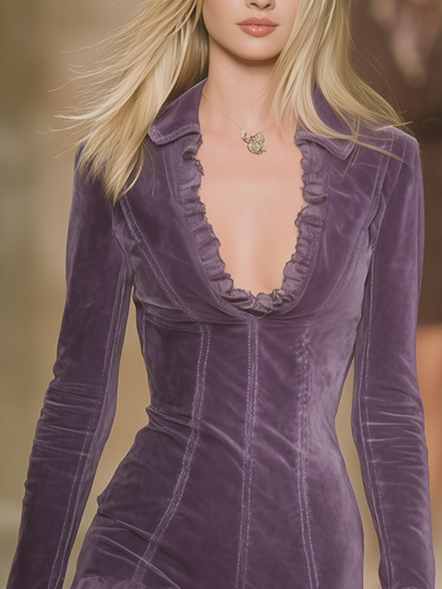 2.Design: V-neck, long sleeves, ruffled details, mini skirt